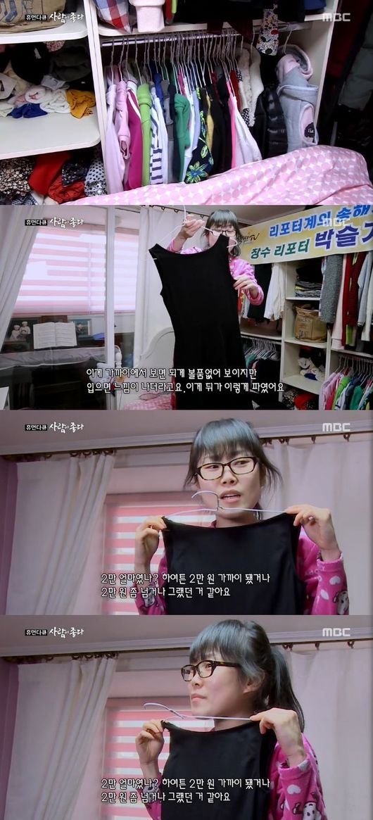박슬기는 31일 방송된 MBC '휴먼다큐 사람이 좋다'(이하 '사람이 좋다')에서 자신의 옷 방을 공개, 2014년 방송연예대상 시상식에서 입었던 의상이 2만원대임을 알렸다.