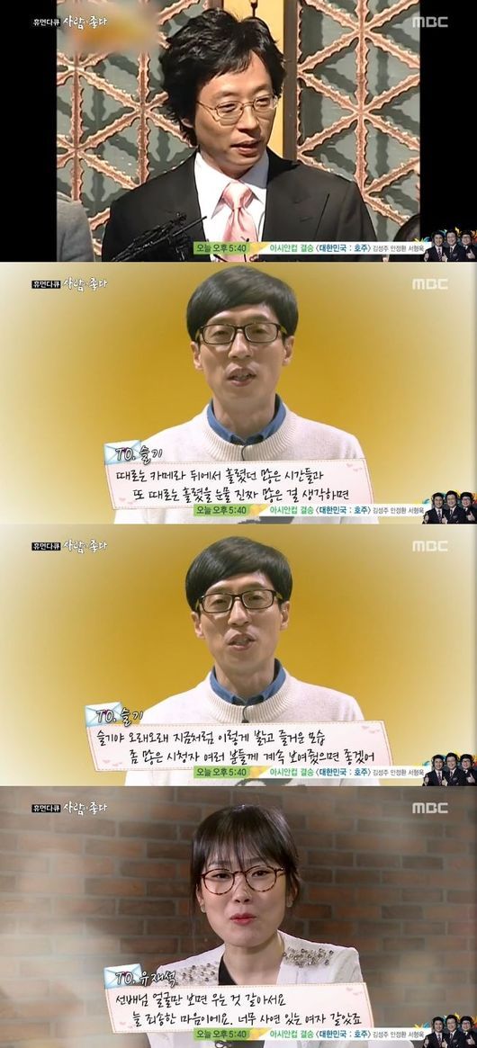 유재석은 31일 방송된 MBC '휴먼다큐 사람이 좋다'(이하 '사람이 좋다')에서 박슬기에 대해 "때로는 카메라 뒤에서 흘렸더 많은 시간, 많은 눈물을 생각하면 받았어도 일찍 받았어야 한다"고 말했다.