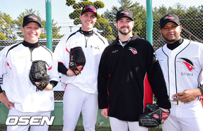 31일 kt위즈의 스프링 캠프가 차려진 일본 미야자키(宮崎)현 휴가(日向)시의 오쿠라가하마 구장에서 kt위즈 용병 옥스프링과 마르테, 필 어윈, 시스코가 포즈를 취하고 있다.