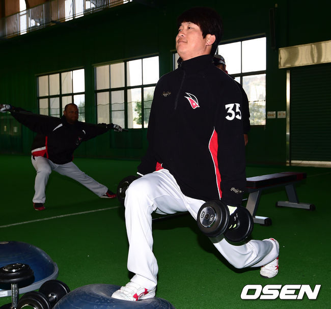 31일 kt위즈의 스프링 캠프가 차려진 일본 미야자키(宮崎)현 휴가(日向)시의 오쿠라가하마 구장에서 kt위즈 신명철이 근력훈련을 하고 있다.