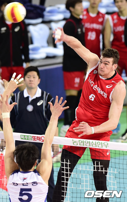 31일 오후 인천 계양체육관에서 열린 '2014-2015 NH농협 V-리그' 대한항공과 LIG 손해보험의 경기, 2세트 LIG 에드가가 스파이크를 시도하고 있다.