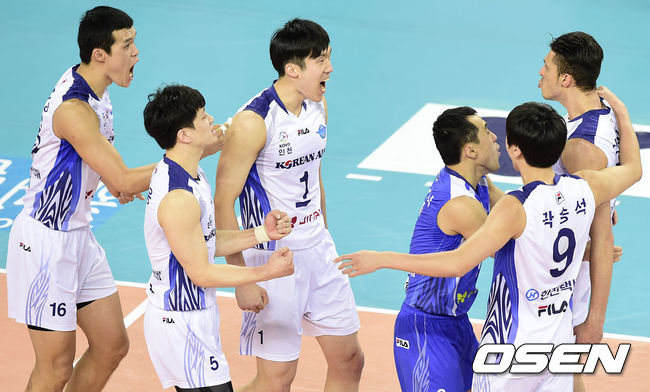 31일 오후 인천 계양체육관에서 열린 '2014-2015 NH농협 V-리그' 대한항공과 LIG 손해보험의 경기, 1세트 대한항공 선수들이 득점에 성공하고 기뻐하고 있다.
