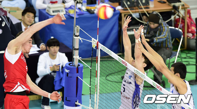 31일 오후 인천 계양체육관에서 열린 '2014-2015 NH농협 V-리그' 대한항공과 LIG 손해보험의 경기, 2세트 LIG 에드가가 스파이크를 시도하고 있다.