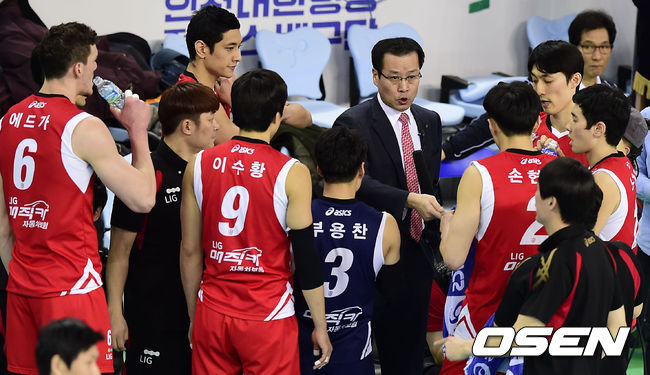 31일 오후 인천 계양체육관에서 열린 '2014-2015 NH농협 V-리그' 대한항공과 LIG 손해보험의 경기, 2세트 LIG 문용관 감독이 작전지시를 하고 있다.