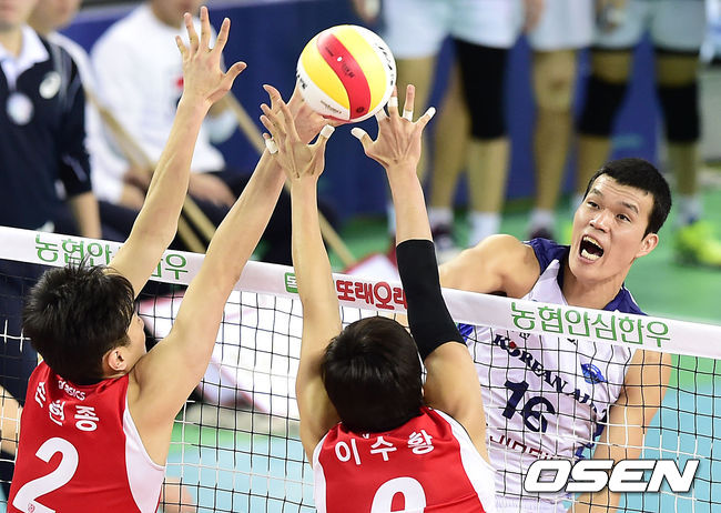 31일 오후 인천 계양체육관에서 열린 '2014-2015 NH농협 V-리그' 대한항공과 LIG 손해보험의 경기, 1세트 대한항공 전진용이 LIG 손현종,이수황의 수비를 피해 공격 시도하고 있다.