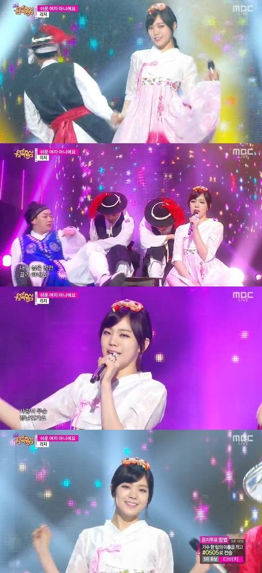 리지는 이날 고운 한복을 입고 무대에 올랐다. 이어 신난 트로트 리듬에 맞춰 애교 가득한 목소리, 안무로 눈과 귀를 함께 사로잡았다.