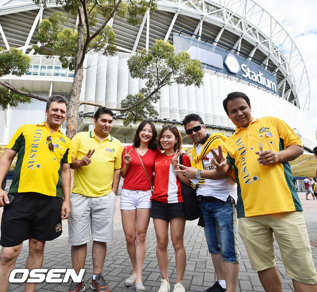 울리 슈틸리케 감독이 이끄는 한국 축구대표팀과 호주대표팀이 31일(이하 한국시간) 호주 시드니에 위치한 스타디움 오스트레일리아서 2015 AFC 아시안컵 결승전을 가질 예정인 가운데 한국 팬들과 호주 팬들이 경기장 밖에서 열띤 응원을 펼치고 있다.