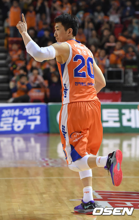 1쿼터 전자랜드 정영삼이 3점슛을 성공한 뒤 기뻐하고 있다.
