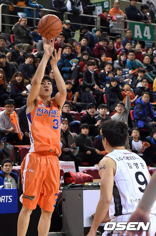 1쿼터 전자랜드 김지완이 슛을 시도하고 있다.
