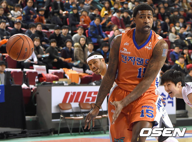 1쿼터 전자랜드 포웰이 노룩 패스를 하고 있다.
