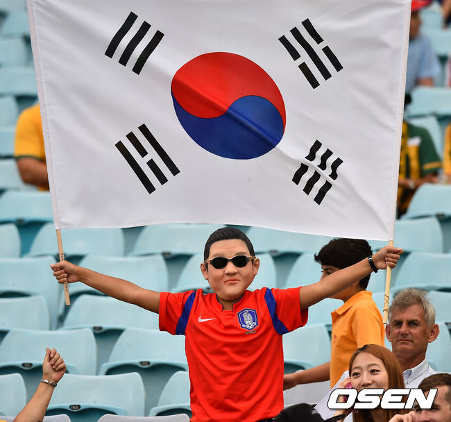경기에 앞서 한국 팬이 싸이 가면을 쓰고 태극기를 들며 열띤 응원을 보내고 있다.
