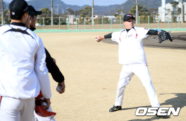 31일 kt위즈의 스프링 캠프가 차려진 일본 미야자키(宮崎)현 휴가(日向)시의 오쿠라가하마 구장에서 kt위즈 옥스프링이 후배 투수들 앞에서 캐치볼을 하고 있다.
