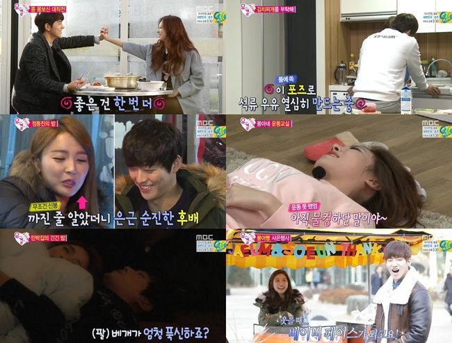 송재림-김소은 커플 역시 만만치 않았다. 김칫국 설욕전을 위해 김치찌개를 만드는 김소은을 뒤에서 바라보는 야릇한 포즈로 애정을 과시했으며 붕어빵 내기를 하면서도 달콤함은 뚝뚝 묻어났다.