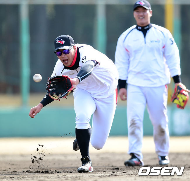 31일 kt위즈의 스프링 캠프가 차려진 일본 미야자키(宮崎)현 휴가(日向)시의 오쿠라가하마 구장에서 kt위즈 김상현이 수비훈련을 하고 있다.