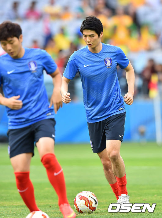 경기에 앞서 한국 기성용이 그라운드에서 몸을 풀고 있다.