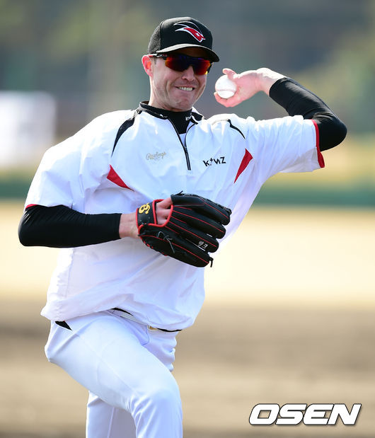 31일 kt위즈의 스프링 캠프가 차려진 일본 미야자키(宮崎)현 휴가(日向)시의 오쿠라가하마 구장에서 kt위즈 시스코가 스프링캠프 첫 훈련서 송구연습을 하고 있다.