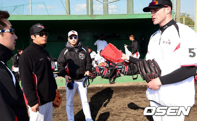 31일 kt위즈의 스프링 캠프가 차려진 일본 미야자키(宮崎)현 휴가(日向)시의 오쿠라가하마 구장에서 kt위즈 신명철과 시스코가 이야기를 나누고 있다.