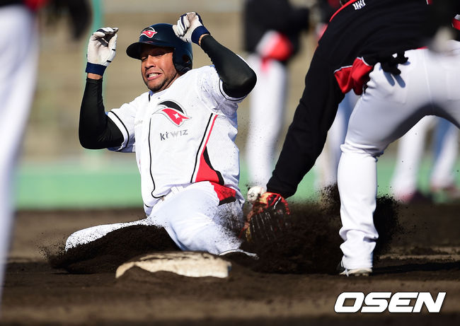 31일 kt위즈의 스프링 캠프가 차려진 일본 미야자키(宮崎)현 휴가(日向)시의 오쿠라가하마 구장에서 kt위즈 마르테가 슬라이딩 연습을 하고 있다.
