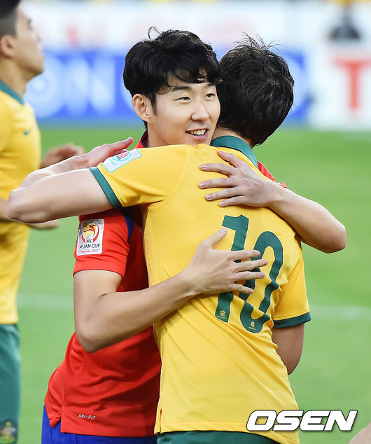 경기에 앞서 한국 손흥민이 호주 크루스와 인사를 나누고 있다.