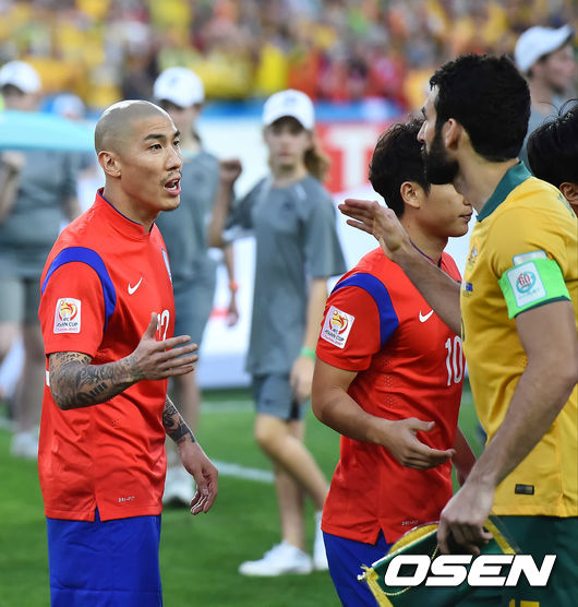 경기에 앞서 한국 차두리가 호주 예디낙과 인사를 나누고 있다.