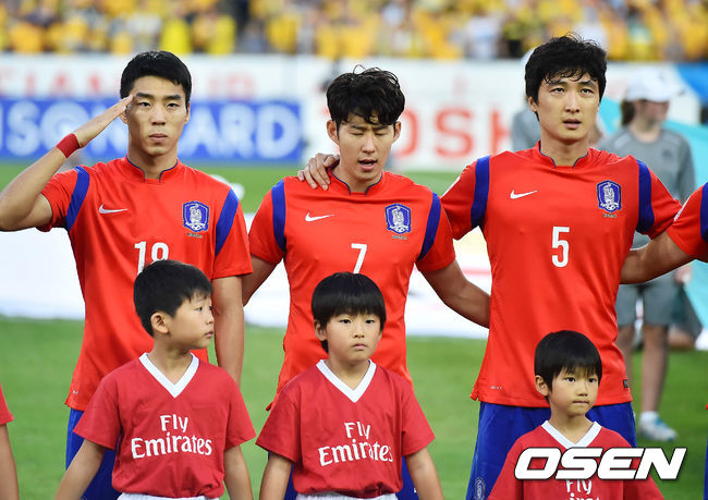 경기에 앞서 한국 이정협, 손흥민, 곽태휘가 국가 연주에 선전을 다짐하고 있다.