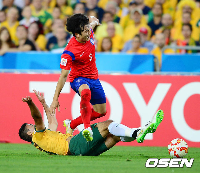 전반 한국 김진수가 호주 수비수의 태클에 걸려 넘어지고 있다.