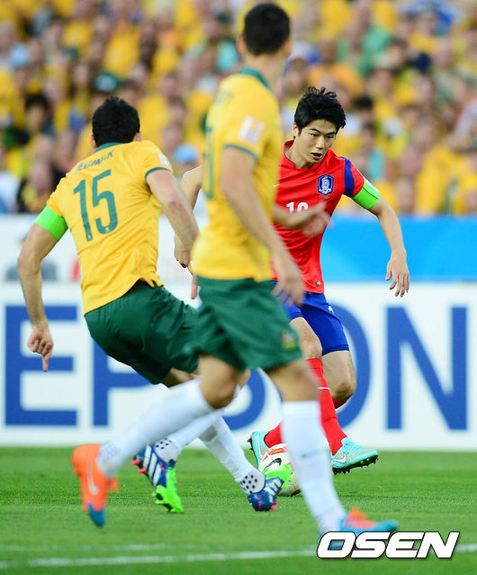 전반 한국 기성용이 호주 예디낙의 수비를 피해 드리블을 하고 있다.