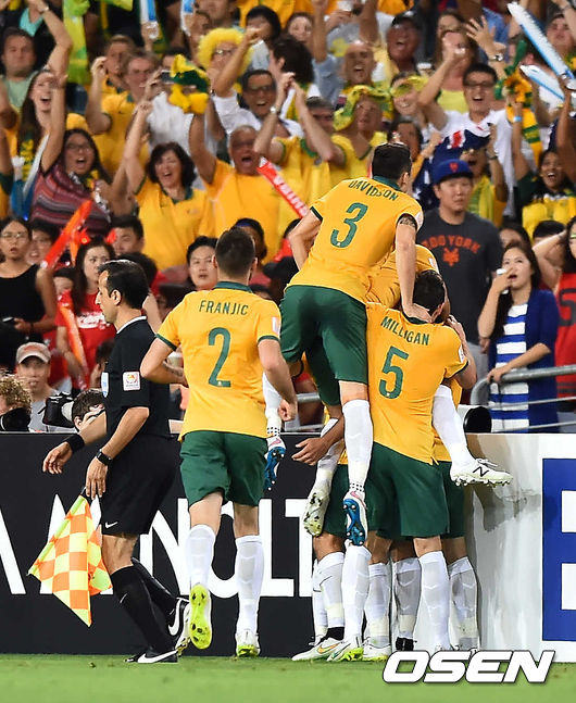 전반 호주 루옹고가 선제골을 넣고 동료선수들과 기뻐하고 있다.