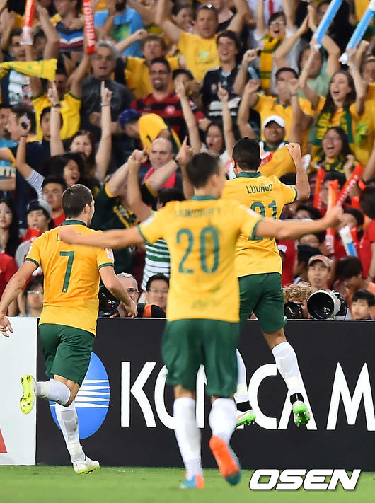전반 호주 루옹고가 선제골을 넣고 동료선수들과 기뻐하고 있다.