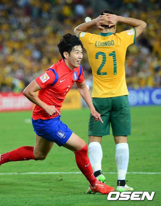 후반 한국 손흥민이 극적인 동점골을 넣고 기뻐하고 있다.
