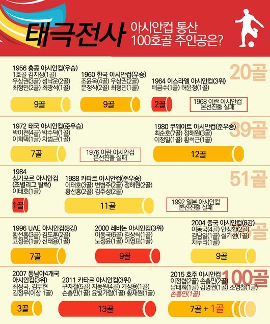 지금까지 13차례 아시안컵 본선에 출전한 한국은 이번 대회 준결승전까지 총 61경기에서 99골을 터뜨렸다. 1호골의 주인공 김지성을 시작으로 준결승전 추가골의 주인공 김영권까지 총 99골이다. 한 골만 넣으면 100호골의 주인공이 될 수 있는 상황이었지만, 전반 45분 마시모 루옹고에게 선제골을 내준 한국은 어렵게 경기를 펼치며 그대로 경기를 마치는 듯 했다.
