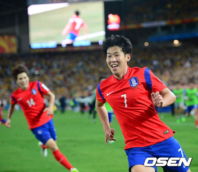 후반 한국 손흥민이 극적인 동점골을 넣고 기뻐하고 있다.