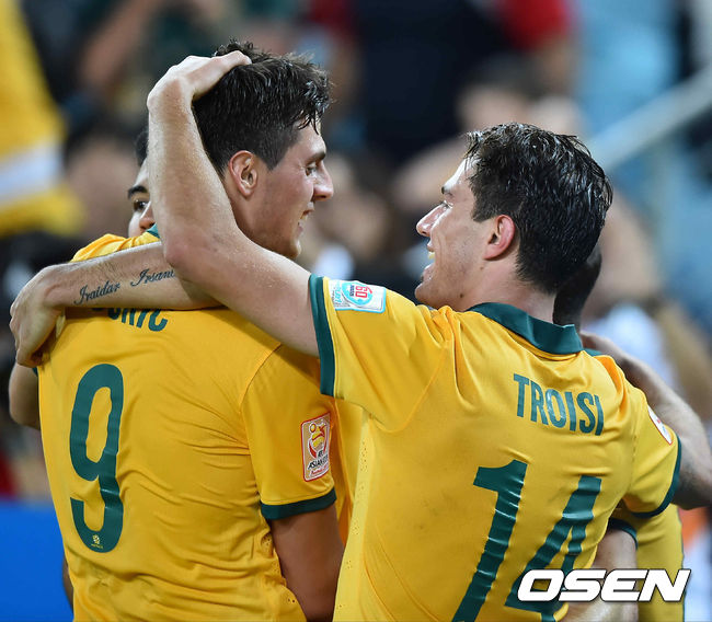 연장 전반 호주 트로이시가 골을 넣고 동료선수들과 기뻐하고 있다.