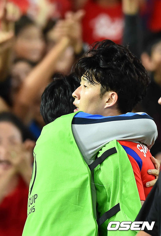 후반 한국 손흥민이 극적인 동점골을 성공시키며 동료선수와 기뻐하고 있다. / rumi@osen.co.kr