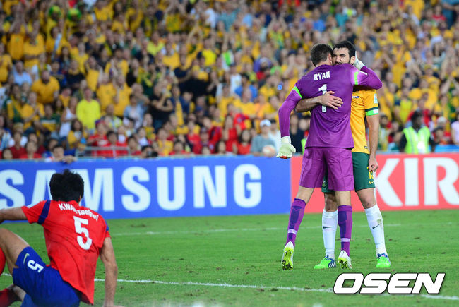 연장 후반 헤딩슛을 시도한 한국 곽태휘가 호주 라이언 골키퍼와 충돌, 파울로 선언되자 예디낙이 라이언 골키퍼를 격려하고 있다. / rumi@osen.co.kr