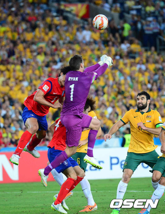 연장 후반 헤딩슛을 시도한 한국 곽태휘가 호주 라이언 골키퍼와 충돌, 파울로 선언되고 있다./ rumi@osen.co.kr