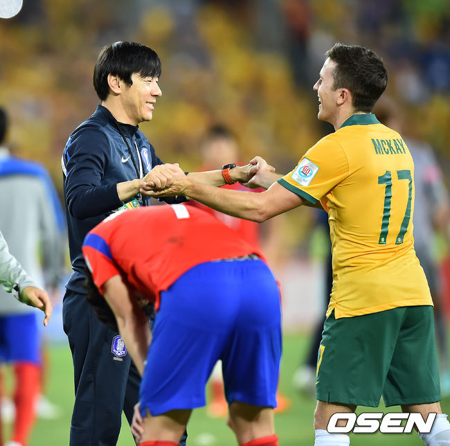 경기후 한국 신태용 코치가 호주 맥케이와 인사를 나누고 있다./ rumi@osen.co.kr