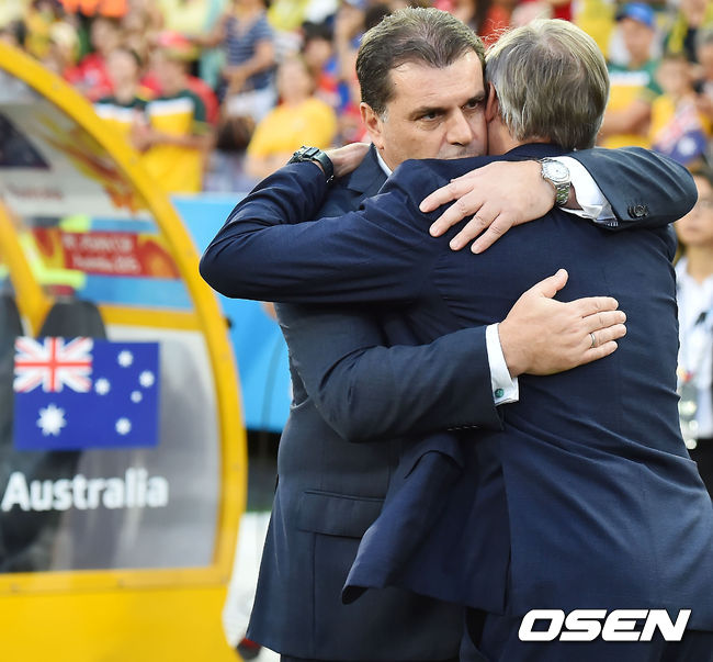 경기 전 엔제 포스테코글루 호주대표팀 감독이 슈틸리케 한국 대표팀 감독과 포옹을 하고 있다./rumi@osen.co.kr