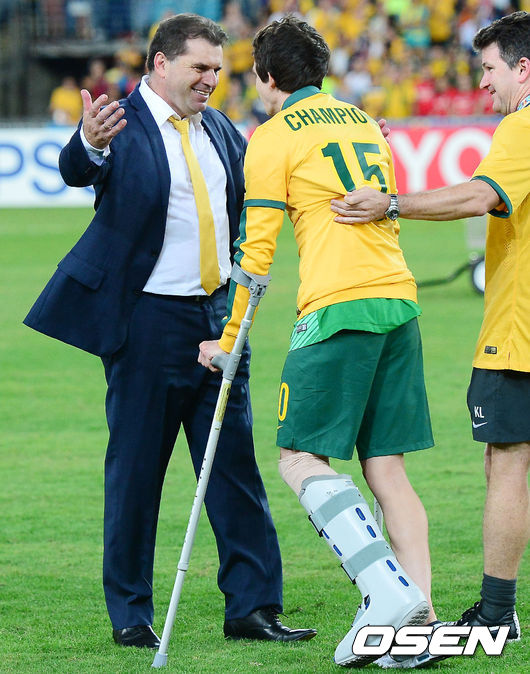 경기를 마치고 엔제 포스테코글루 호주대표팀 감독이 로비 크루즈와 포옹을 하고 있다./rumi@osen.co.kr