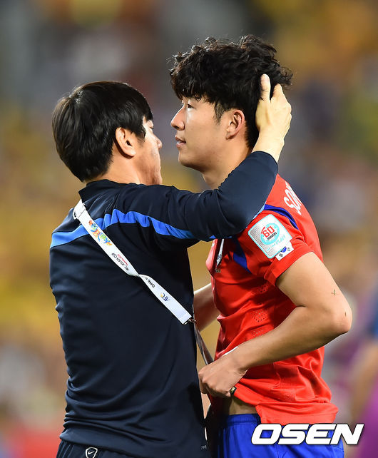 경기후 신태용 코치가 손흥민을 위로하고 있다./ rumi@osen.co.kr