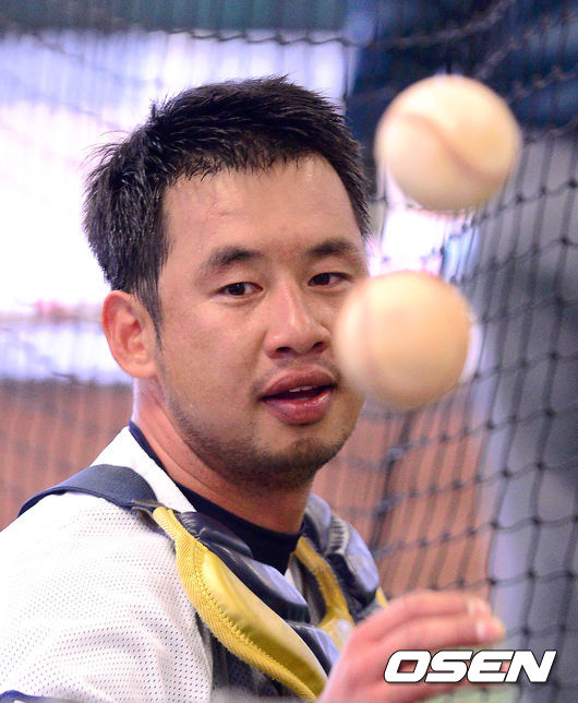 이상기후로 연 이틀 비가 내리는 가운데 이승재 포수가 훈련을 하고 있다./spjj@osen.co.kr