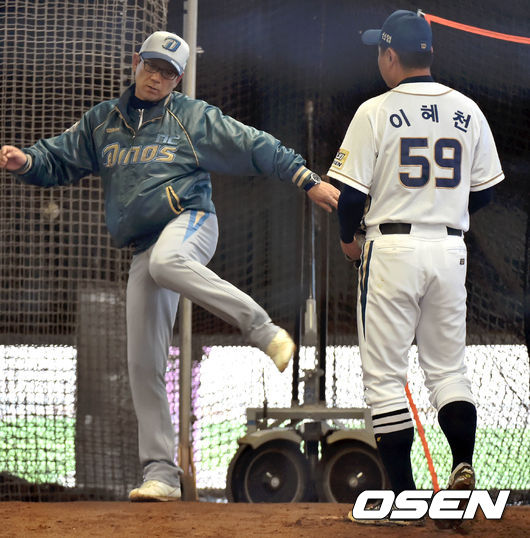 이상기후로 연 이틀 비가 내리는 가운데 최일언 코치가 불펜피칭을 하는 이혜천에게 키킹을 과감하게 하라고 주문하고 있다./spjj@osen.co.kr