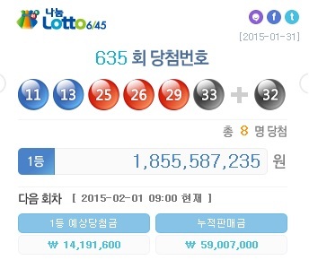 1일 나눔로또에 따르면 당첨번호 6개를 모두 맞힌 1등 당첨자는 총 8명이다. 각각 18억 5558만 7235원을 받는다. 나눔로또 추첨 결과 '11, 13, 25, 26, 29, 33' 등 6개가 1등 당첨번호로 선정됐다. 2등 보너스 번호는 '32'이다.