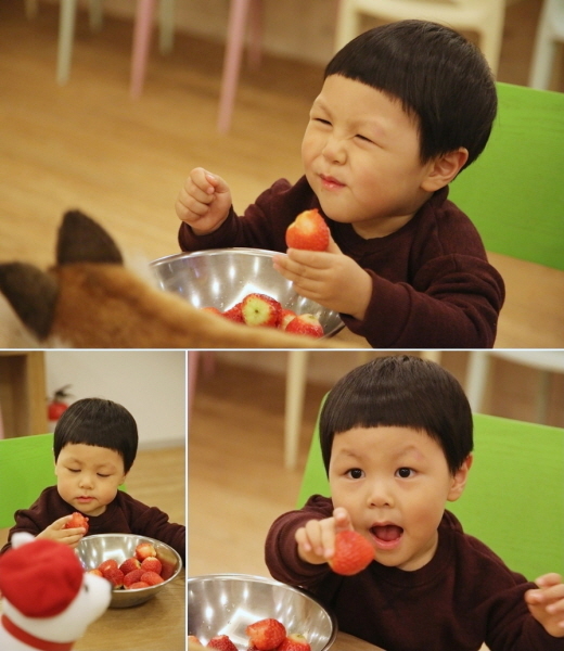 MBC 예능프로그램 '일밤-애니멀즈' 측은 코너 '유치원에 간 강아지'에 출연 중인 4세 윤석이의 딸기 '먹방' 사진을 1일 공개했다.
