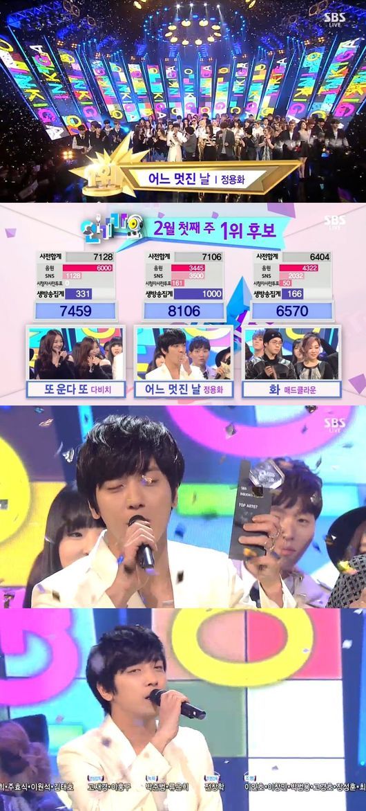 정용화는 1일 오후 생방송 SBS '인기가요'에서 신곡 '어느 멋진 날'로 1위에 올랐다.
