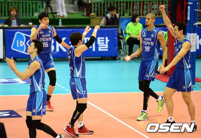 1일 오후 경기도 수원체육관에서 열린 '2014-2015 NH농협 V-리그' 한국전력과 삼성화재의 경기, 2세트를 이긴 삼성화재 선수들이 기뻐하고 있다.