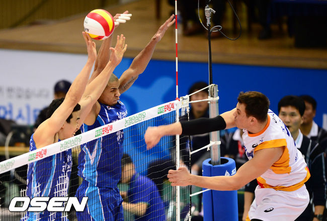 1일 오후 경기도 수원체육관에서 열린 '2014-2015 NH농협 V-리그' 한국전력과 삼성화재의 경기, 2세트 한국전력 쥬리치가 공격을 시도하고 있다.