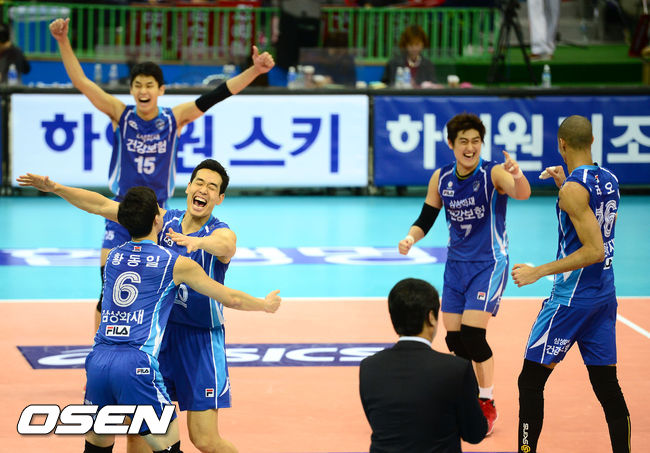 1일 오후 경기도 수원체육관에서 열린 '2014-2015 NH농협 V-리그' 한국전력과 삼성화재의 경기, 3세트를 이긴 삼성화재 선수들이 기뻐하고 있다.