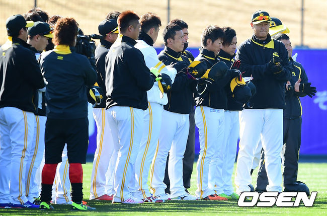 1일 오후 일본 미야자키(宮崎) 이키메노모리 운동공원 내 아이비스타디움에서 진행된 일본 프로야구 소프트뱅크 스프링캠프, 이대호가 구도 감독의 소개때 박수를 치고 있다.