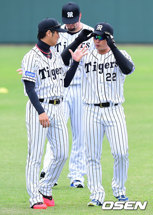 오승환이 워밍업 훈련 중 팀 동료 니시오카와 대화를 나누고 있다.